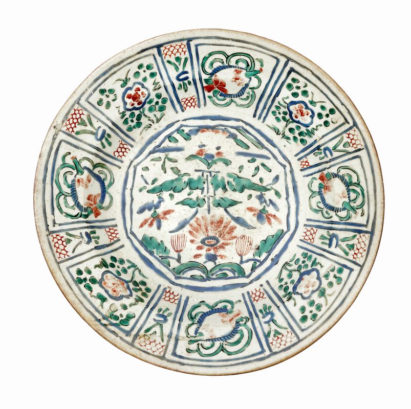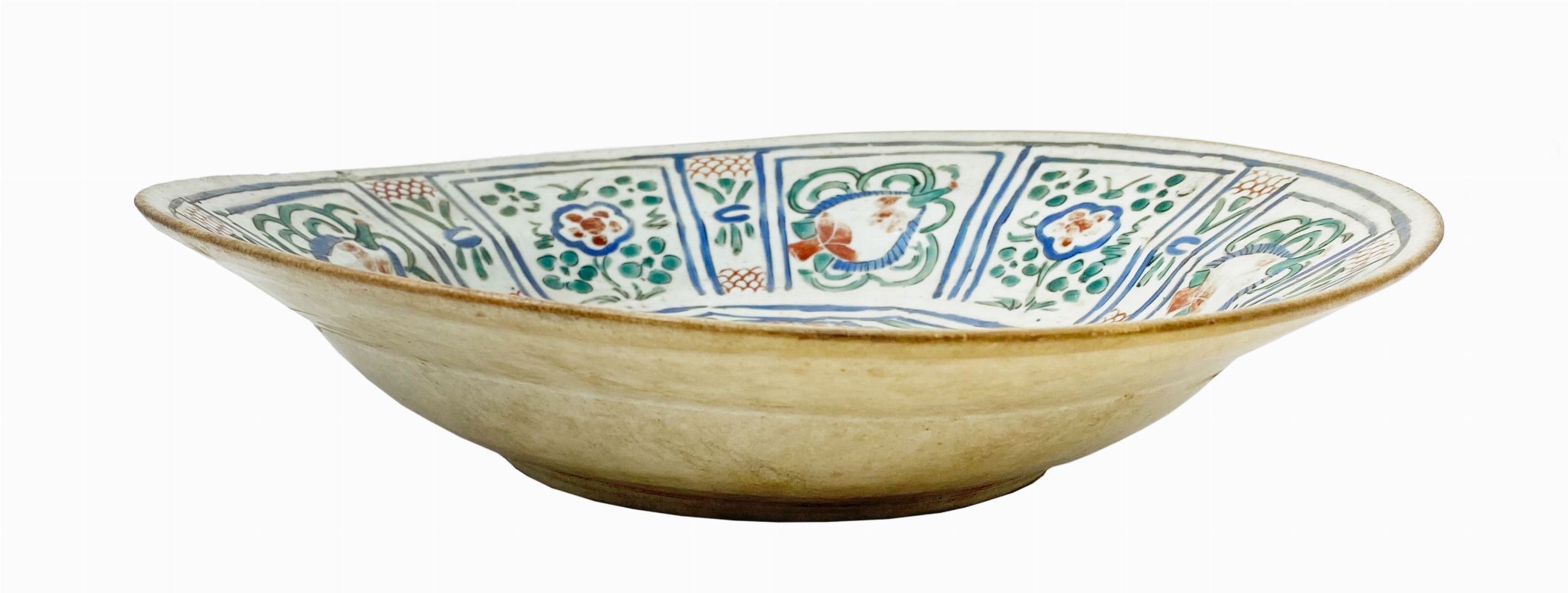 Ciotola campaniforme Swatow, tipologia Kraak, con decori floreali in blu e rosso. Altezza: cm 7,5. Ø base: cm 15,5. Ø apertura: cm 32,7. Grande fiore in rosso e blu entro ottagono irregolare sul fondo, decorazioni floreali stilizzate entro sezioni trapezoidali sulla parete interna, su quella esterna tre gruppi di minute decorazioni stilizzate. Vetrina in tenuissimo color grigio/verde.