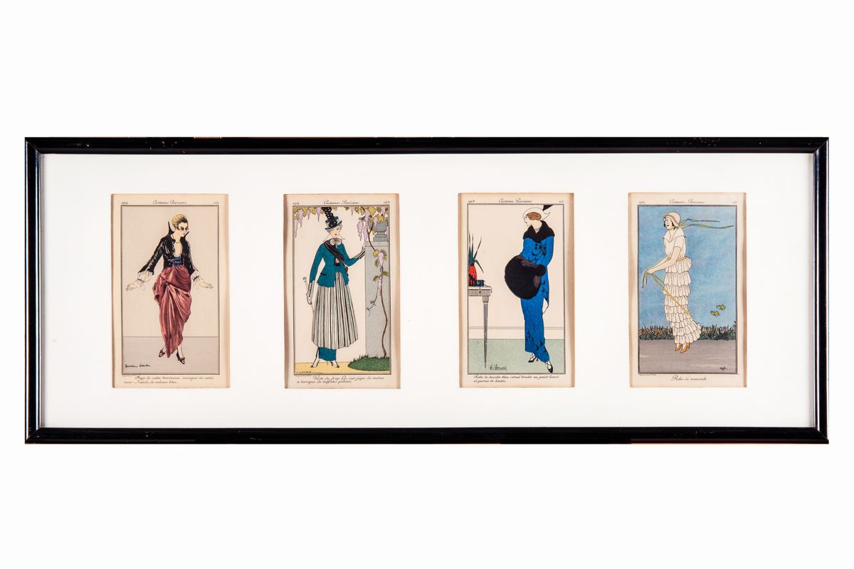 4 meravigliose incisioni provenienti dai Costumes Parisiens. mm 175x111 (visibili). Tutte con firma dell'artista in lastra, titolo in basso al centro, nome dell'opera di provenienza in alto al centro, numero di pagina e anno in alto ai lati.