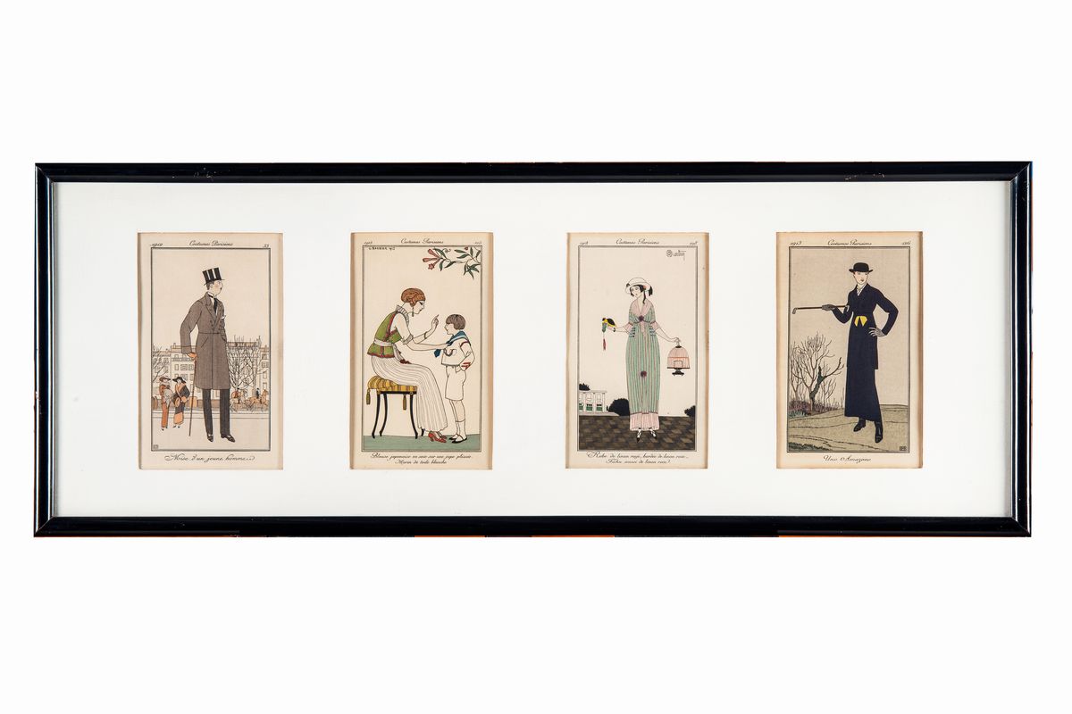 4 meravigliose incisioni provenienti dai Costumes Parisiens. mm 175x111 (visibili). Tutte con firma dell'artista in lastra, titolo in basso al centro, nome dell'opera di provenienza in alto al centro, numero di pagina e anno in alto ai lati.