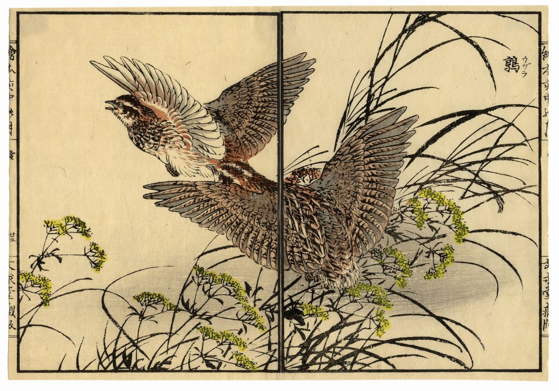 Benizuri-e (xilografia in rosa e grigio, oltre a nero e gradazioni di tono). Formato: Ogata-chuban (mm 210/214x299/300). Editore: Tanaka Jihe, Kyoto. Due tavole su due pagine stampate su carta "gampi" da Ehon inaka no tsuki (La luna nella campagna), raccolta di fiori e animali in 3 volumi. SI AGGIUNGE: Kikuchi Hobun (Osaka, 1862-1918). Oche sul bordo di uno stagno. 1891 (Meiji 24). Nishiki-e (xilografia a colori). Formato: chuban orizzontale (mm 194x250). Editore: Shunyodo. Nell'iconografia giapponese le oche erano simbolo di felicità e fedeltà coniugale.
