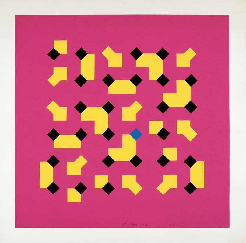 Serigrafia su carta Fabriano. mm 596x596. Foglio: mm 700x695. Firmata e datata a matita in basso al centro e a fianco: "p. d. a.".