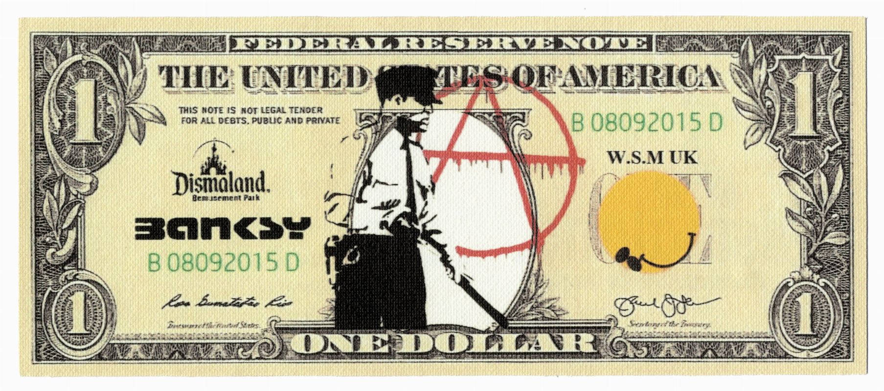 Serigrafia e stencil su tela. mm 115x265. Timbro a sinistra: "Dismaland Bemusement Park. Banksy. B 08092015 D". Al verso ulteriore timbro di Dismaland e poi: "Dismal Art: Dismal Dollar Canvas. Date: August/September 2015. Location: Weston-super-Mare. This dismaland souvenir work is an original work of art." Accompagnato dal ticket originale d'ingresso a Dismaland, con QR code e codice a barre. Il nome del partecipante è stato cancellato a pennarello per motivi di privacy. Provenienza: Performance di Banksy a Dismaland (agosto/settembre 2015); Importante collezione parigina.