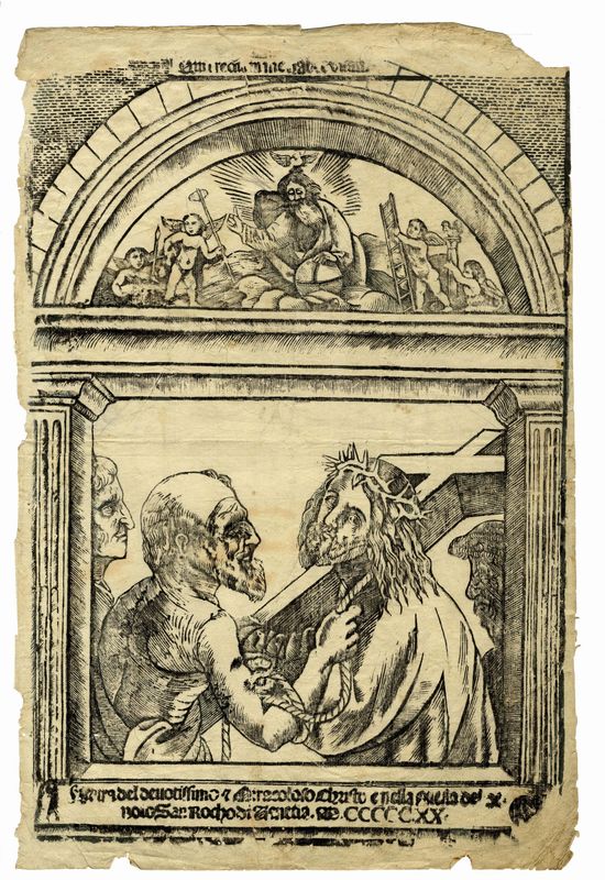Xilografia. mm 390x265. Foglio: mm 415x270. Xilografia di devozione popolare tratta dal dipinto attribuito a Giorgione raffigurante Cristo portacroce nella chiesa di San Rocco a Venezia. Questa immagine di Cristo, a lungo considerata miracolosa, era anticamente esposta nella chiesa e raccoglieva offerte così cospicue che fu possibile grazie a queste avviare i lavori per la sede monumentale della Scuola Grande. Buona impressione con ancora tutti i segni ben visibili su carta vergellata sottile con filigrana non ben distinguibile in cerchio singolo irregolare.