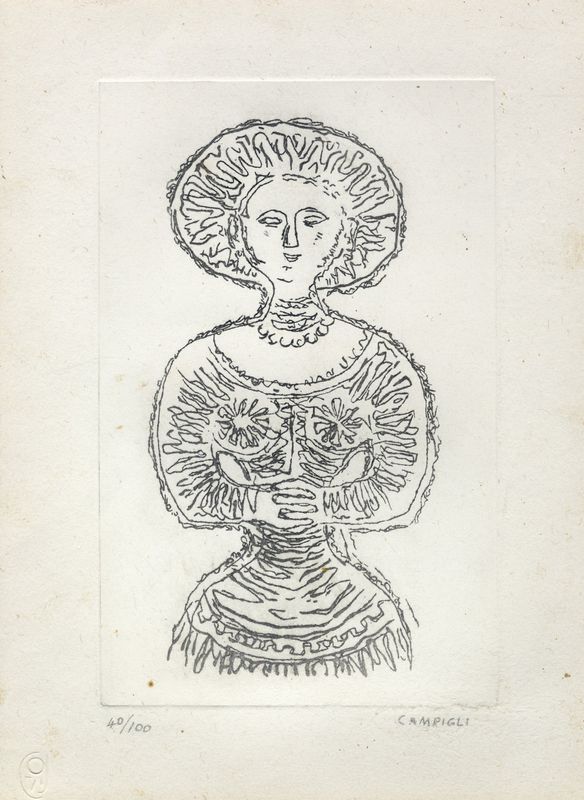 Acquaforte. mm 245x155. Foglio: mm 335x255. Firma a matita in basso a destra e tiratura in basso a sinistra. Sotto alla tiratura è presente il timbro a secco dell'editore. Es. 40/100.