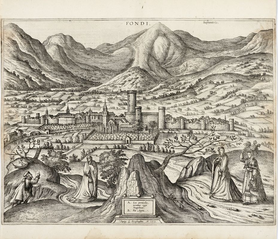 Incisione in rame. mm 346x463. Foglio: mm 420x463. Dal V volume di Civitates Orbis Terrarum, pubblicato per la prima volta nell'edizione latina l'anno 1598. Testo francese al verso. Con il titolo in alto al centro, la firma che assegna il disegno a Joris Hoefnagel e la data in basso sul basamento: "Deping : G : Houfnaglius A° 1578". Cittadina ai piedi dei Monti Ausoni, accanto alla Via Appia, a circa 20 km a nord-ovest di Gaeta.