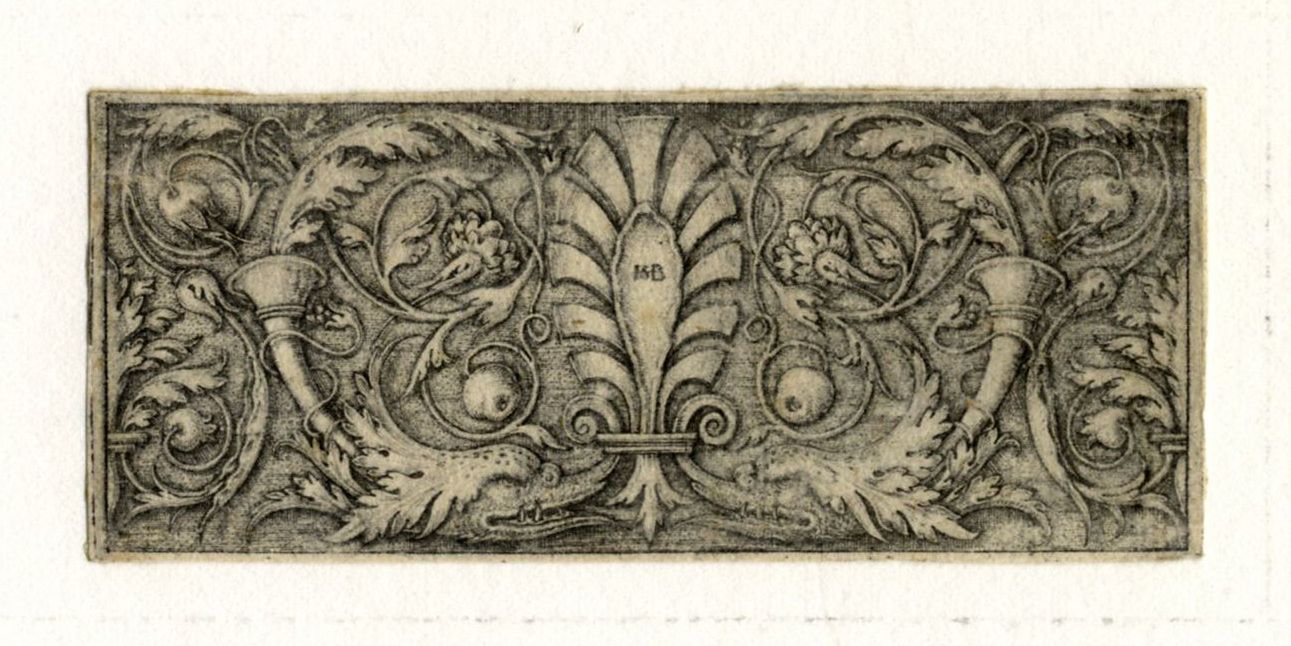Bulino. mm 40x94. Bartsch, 235. Hollstein, 240. Con il monogramma al centro nella palmetta. Buona prova su carta vergellata sottile.