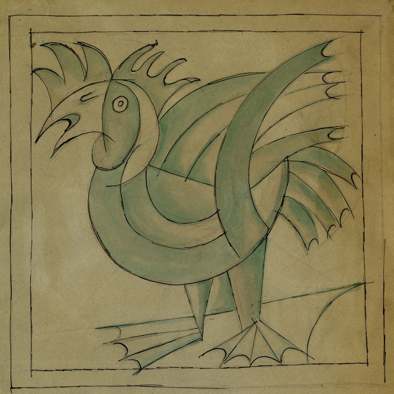 Acquerello e penna e inchiostro di china su carta pesante. mm 305x300. L'opera è accompagnata dal certificato di autenticità dell'Archivio Depero. Il Dottor Scudiero scrive, a tal proposito: "Il gallo è stato un motivo trasversale a tutta la produzione di Depero sin dal 1913, con un bassorilievo, e poi con Kikigolà, un gallo semi-astratto del 1915, per non parlare dei vari dipinti con il gallo ed altri animali da cortile dagli anni Trenta in poi e infine con Iride nucleare di gallo del 1950, che segue questo disegno. Il termine nucleare deriva dal fatto che Depero sul finire degli anni Quaranta stava pensando al Manifesto della Pittura e Plastica Nucleare che pubblicherà nel 1951[...] E questo disegno, di quel dipinto del 1950, ne è in effetti una prima meditazione formale [...]"