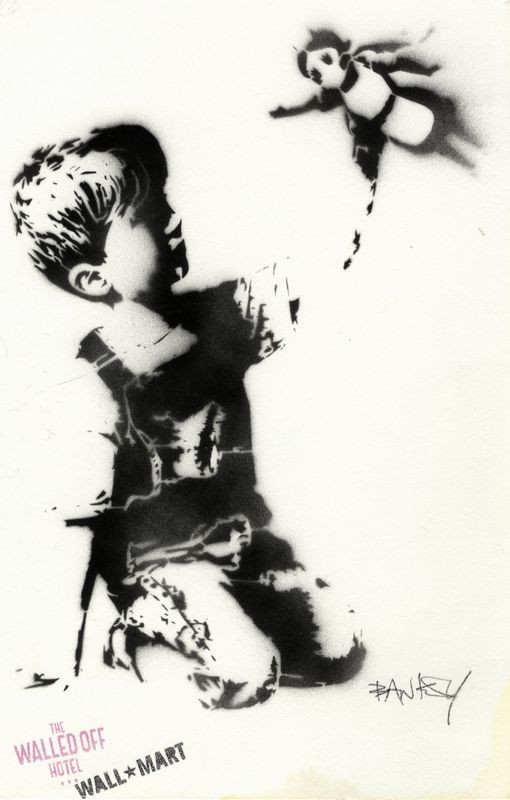 Stencil e vernice spray su cartoncino. cm 29,5x19,6. Timbro in basso a destra: "Banksy" e in basso a sinistra: "The Walled Off Hotel. Wall Mart". Al verso timbro: Free Palestine, Free Syria, Free Libya". Provenienza: collezione londinese; importante collezione fiorentina. The Walled Off Hotel, voluto da Banksy nel 2017 con vista sul muro che divide la Palestina da Israele, rimanda simbolicamente alla catena di hotel di lusso Waldorf.