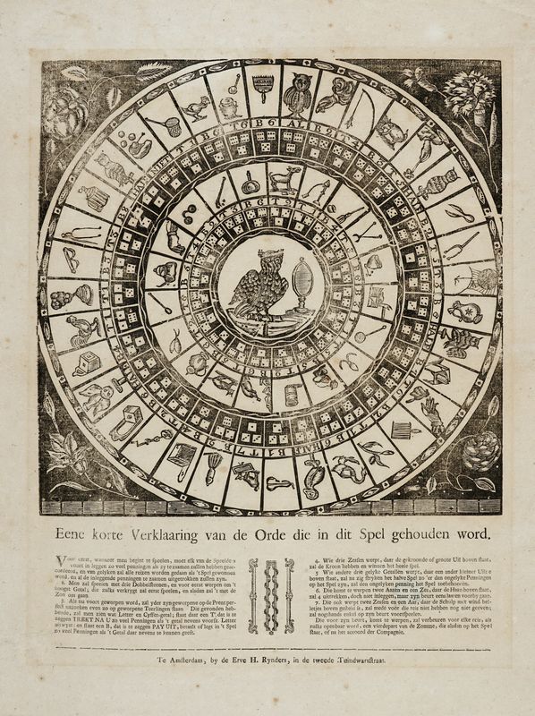 Xilografia. mm 485x370. Foglio: mm 605x450. Gioco da tavolo da praticare con i dadi, in 56 caselle non numerate disposte in due cerchi concentrici. Ai quattro angoli sono intagliati dei fiori, al centro un gufo e uno specchio. Ogni casella presenta una figura e una combinazione di dadi. Le combinazioni perdenti o vincenti sono contrassegnate con le sigle B (paga) e T (tira). Il nome del gioco significa "spennare la civetta" e consiste nel lanciare tre dadi e raggiungere la casella, che corrisponde alla combinazione di dadi ottenuta, sul cerchio interno o esterno, per poi eseguire le istruzioni scritte in basso, su due colonne. Ottima impressione stampata con evidente gauffrage su carta vergellata sottile con filigrana "giglio di Strasburgo". La famiglia degli stampatori Rynders fu attiva dal 1750 al 1854 circa ed eseguì ristampe di molte matrici in legno del XVII e XVIII secolo. L'esecuzione dell'intaglio risale probabilmente all'inizio del XVIII secolo e la stampa da parte di Erve H. Rynders (erede Rynders) tra il 1781 e il 1831.