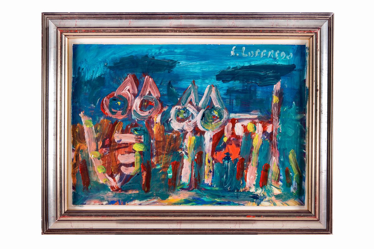 Tempera su carta. mm 490x690. Firmato in alto a destra e controfirmato al verso, con l'aggiunta dello schizzo di tre gatti e l'affermazione: "è mio".
