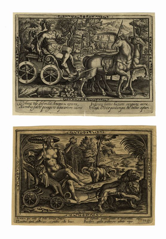 Bulino. mm 128/133x184/187. Foglio: mm 135/140x194. Serie completa in quattro tavole, tratte in controparte da originali di Julius Goltzius. Al margine in basso a destra della tavola con l'Africa, excudit di Jean Le Clerc (Parigi, 1560-1621/1622).