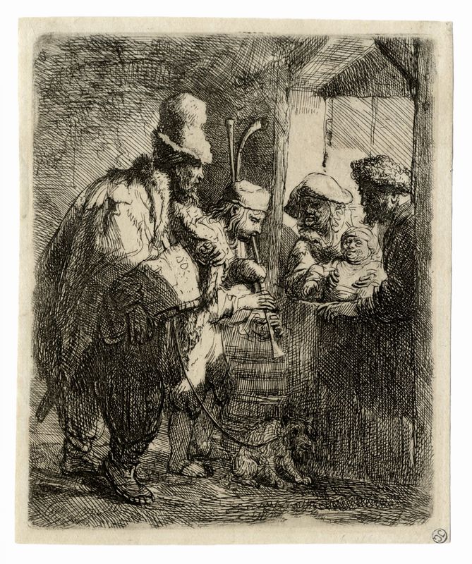 Acquaforte. mm 138x115. Foglio: mm 148x120. White & Boon, 119. New Hollstein, 141. Buona prova nel II stato su 2 secondo White & Boon e nel III di 3 secondo New Hollstein con nuovi tratti quasi in verticale sotto la gironda e la mano destra del suonatore. Carta vergellata sottile priva di filigrana. In basso a destra timbro di collezione con lettere "JC" in cerchio singolo (non su Lugt).