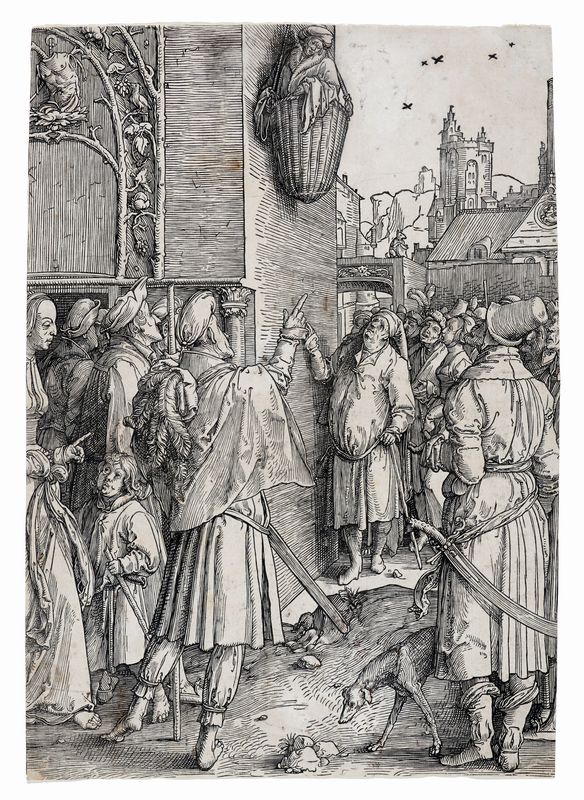 Xilografia. mm 393x273. Bartsch,VII, 16. New Hollstein, 180 (b/c). Dalla serie Il grande potere delle donne. Bellissima impressione di questa rara xilografia nella variante b su c censita da New Hollstein, dopo la scomparsa degli uccelli nel cielo tra le due piccole torri, ma prima di spacchi in verticale e di più accentuati segni di usura. Carta vergellata sottile apparentemente priva di filigrana. Al verso in basso marchio di collezione con "lettere GC contrapposte entro cerchio" (non su Lugt).