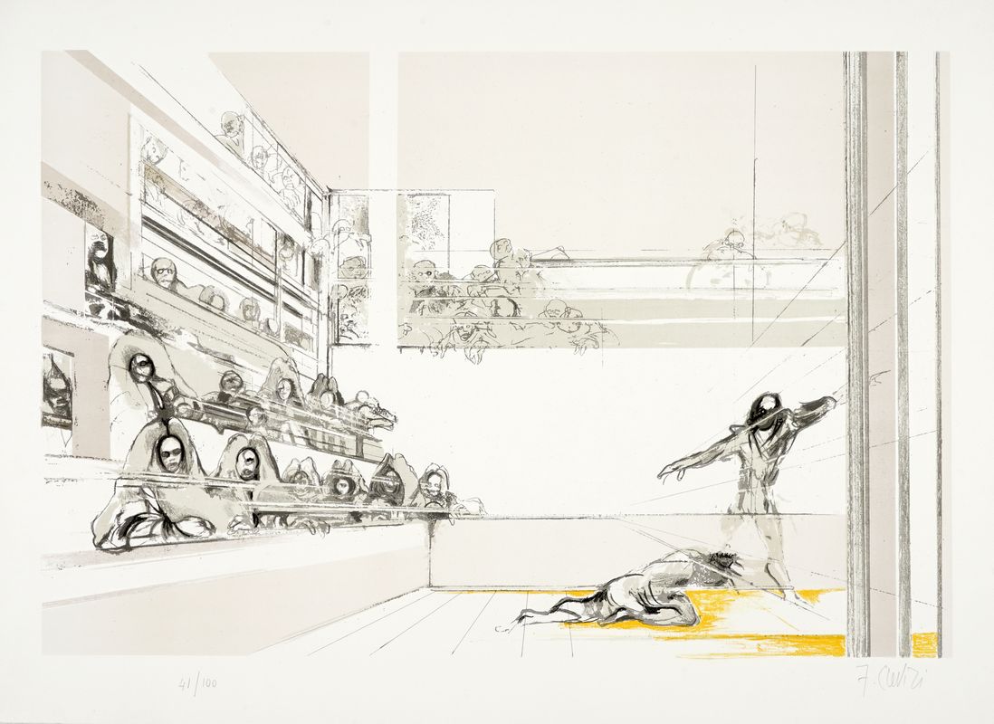 Litografia. mm 500x700. Firmata a matita in basso a destra e numerata in basso a sinistra. Es. 41/100. Conservata nella sua cartella editoriale originale.