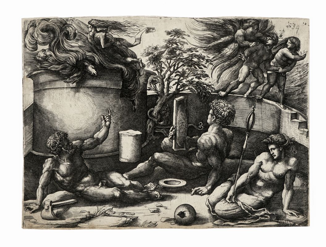 Bulino. mm 238x322. Bartsch, XV,3. Oberhuber (Renaissance in Italien: 16. Jahrhundert), p. 171. TIB, 28 (Commentary), n. 2801.003, p. 6. L'incisione è stata variamente attribuita nel tempo: a Bonasone da Malvasia e in tempi più recenti da Stefania Massari che assegna comunque l'invenzione all'Aspertini; interamente ad Amico Aspertini, pur con qualche margine di dubbio, da Bartsch, Oberhuber e Archer nel Bartsch illustrato. Bellissima prova, nitidamente impressa con inchiostrazione piena e brillante ed evidenti tracce di pulitura della lastra, su carta vergellata sottile priva di filigrana.