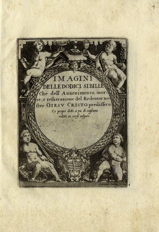 Volumetto In-4° composto da Imagini / delle dodici Sibille / che dell Avvenimento, mor / te, e resurrezione del Redentor no / stro Giesu Cristo predissero / Co propri detti à pie di ciascuna / ridotti in versi volgari, serie in 14 tavole e frontespizio a bulino (mm 114x155. Foglio: mm 255x183). Alla tavola di frontespizio in basso a destra "Dominici Falcini formis". Seguono nel volume senza indicazioni di responsabilità, dodici tavole con Storie di Gesù a bulino (mm 128x188); e la serie Vittoria sui sette vizi capitali, in 8 tavole a bulino compreso frontespizio (mm 122x189). Legatura antica in piena pergamena. Bellissime impressioni ricche di contrasto su carta vergellata sottile.