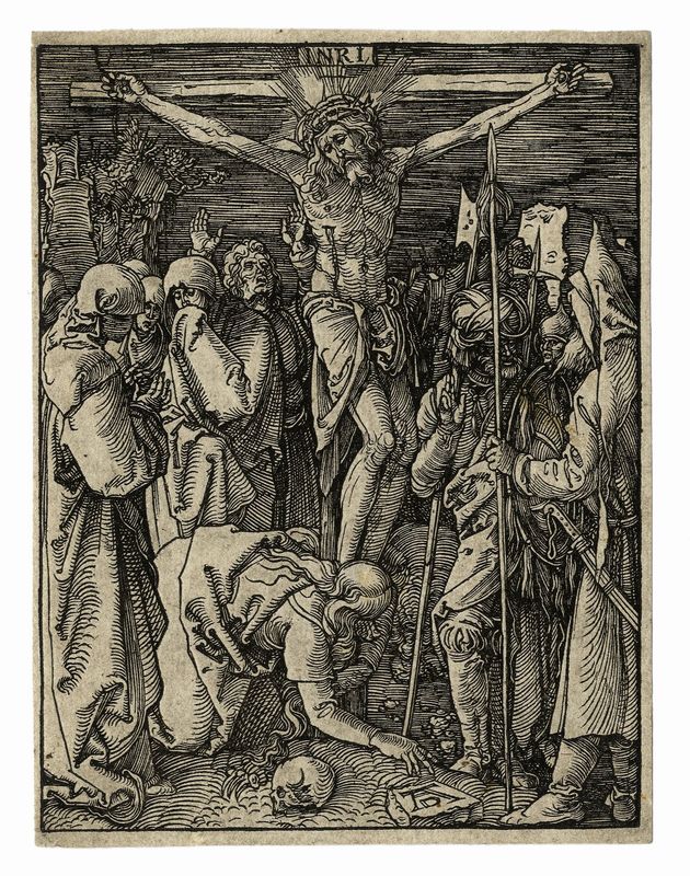 Xilografia. mm 127x97. Foglio: mm: 133x100. Meder, 149. Strauss (Woodcuts), 124. Schoch, Mende, Scherbaum (Holzschnitte), 210. Con il monogramma sulla pietra in basso verso destra. Da La piccola passione su legno, serie in 37 tavole completa di frontespizio realizzata da Dürer tra il 1508 e il 1510. Bellissima prova dall'edizione avanti il testo latino, stampata con inchiostrazione piena ed evidente gauffrage su carta vergellata sottile apparentemente priva di filigrana.