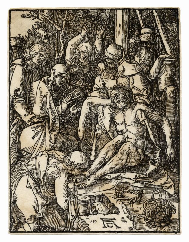 Xilografia. mm 127x97. Foglio: mm 130x100. Meder, 152 (copia). Strauss (Woodcuts), 127 (copia). Schoch, Mende, Scherbaum (Holzschnitte), 213 (copia). Copia ingannevole (con la linea trasversale sulla manica di san Giovanni che dal bordo sinistro si estende fino al colletto) da La piccola passione su legno, serie in 37 tavole completa di frontespizio realizzata da Dürer tra il 1508 e il 1510. L'incisore ed editore fiammingo Johann Mommard fornì una copia della serie fedelissima all'originale: la prima edizione delle trentasei xilografie della Piccola Passione apparve nel 1587 (quasi 59 anni dopo la morte di Durer) e una seconda edizione nel 1644 (116 anni dopo la morte di Durer). Bellissima impressione ottimamente inchiostrata su carta vergellata sottile con filigrana identificabile con "testa di toro con lettere JZ" (Meder,70).