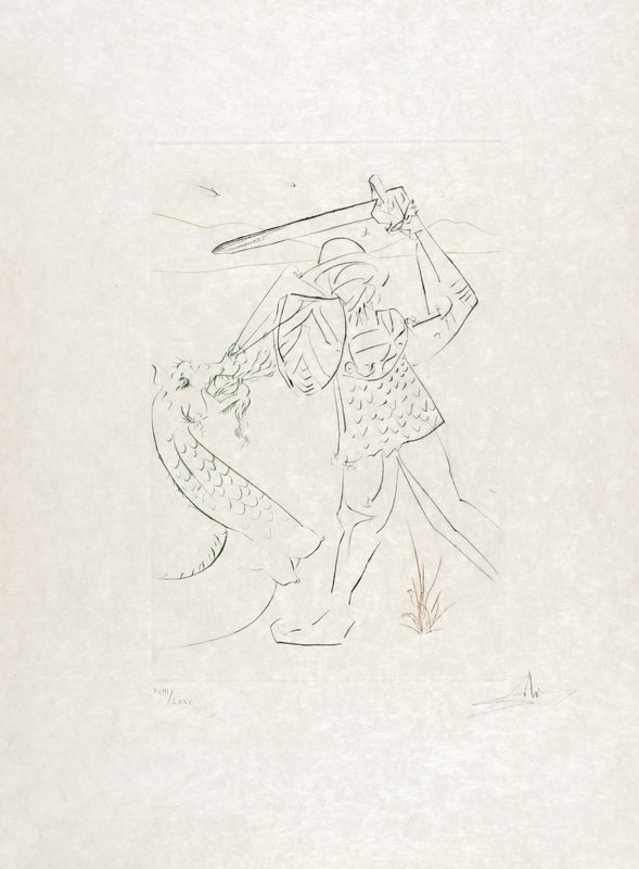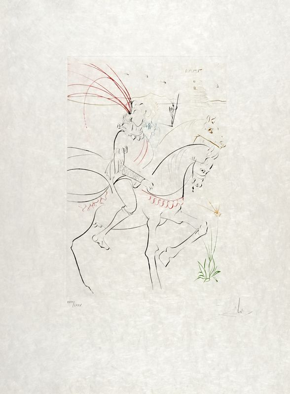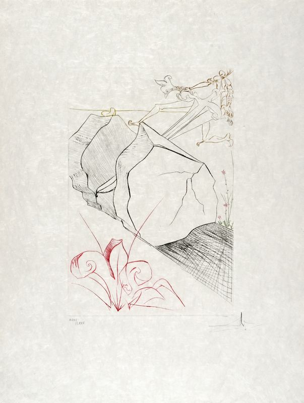 Cartella in-folio (mm 705x550) contenente 12 incisioni originali a colori su carta Japon Nacré (mm 395x265. Fogli: mm 665x510) di Salvador Dalì, numerate in basso a sinistra e firmate a matita in basso a destra. Ciascuna contenuta entro cartella in cartonato nero. Ottimo esemplare. Cartella editoriale in tela rossa con il nome dell'artista impresso in oro al piatto anteriore. Esemplare n. XVIII su una tiratura complessiva di 75. Esiste poi un'altra tiratura a numeri arabi su una tiratura di 225 esemplari.