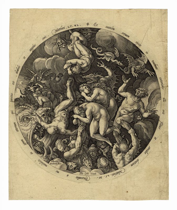 Bulino su lastra rotonda. Ø mm 262. Foglio: mm 305/307x265/270. New Hollstein (Goltzius), 342 e 345. Con in basso il nome dello Stradano inventore e l'excudit di Philips Galle. Tavola 1 e 4 da Le ultime quattro cose, serie databile al 1578 circa da invenzioni di Jan van der Straet ed edita per la prima volta ad Anversa da Philips Galle. Bellissime impressioni, nel I stato di 2 la tavola 1, prima della comparsa del nome dell'incisore "HG sculp" in basso a sinistra, dell'indirizzo di Visscher e della numerazione; nel II stato di 3 la tavola 4, dopo la sostituzione con turbanti del cappello cardinalizio e della tiara nelle due figure in basso al centro, e prima della comparsa del nome dell'incisore e della numerazione. Carta vergellata sottile con filigrana "lettera B entro scudo coronato" (Briquet, 8070 - Amsterdam, 1574) presente su entrambi i fogli.
