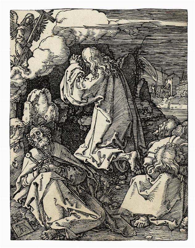 Xilografia. mm 127x97. Meder, 135. Strauss (Woodcuts), 142. Schoch/Mende/Scherbaum (Holzschnitte), 196. Con il monogramma nella tavoletta in basso a sinistra. Da La piccola passione su legno. Bellissima impressione avanti il testo latino, stampata con inchiostrazione piena su carta vergellata sottile apparentemente priva di filigrana. Al verso marchio in blu della collezione di Heinrich Anton Cornill-D'Orville direttore del museo Städel, Francoforte sul Meno (Lugt, 529).