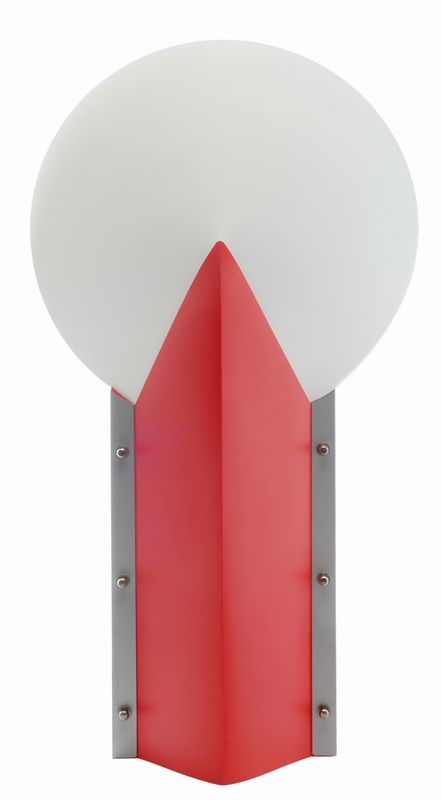 Plastica mobida con dettagli metallici. cm 56x30x15. Disegnata da Samuel Parker per Slamp. Lampada da tavolo realizzata dall'accoppiamento di due sagome plastiche speculari unite da profili metallici bullonati insieme. La scocca si apre alla sommità lasciando uscire la luce non filtrata nell'ambiente, mentre nel corpo l'illuminazione acquisisce toni più gentili e tenui. Telaio plastico completamente bianco ma schermato di rosso su una parte della lampada. Modello progettato nel 1993 e mandato in produzione nel '94, dettagli di fabbrica indicati alla base dell'oggetto.