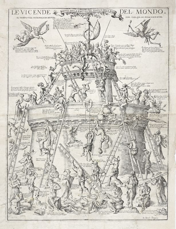 Acquaforte. mm 647x493 (in due lastre). Foglio: mm 715x560. Varignana, 381. In basso a destra sulla lastra "GM Mitelli Intaglio", in basso a sinistra sotto la figura a mani giunte la data"1687". Tavola di grande rarità con la Fortuna alla sommità di un torrione, affiancata dal Tempo e dalla Morte, e una folla di personaggi che esemplificano tutti gli aspetti della volubilità della dea bendata. Bella impressione su carta vergellata pesante con filigrana "cerchi vuoti e lettere".