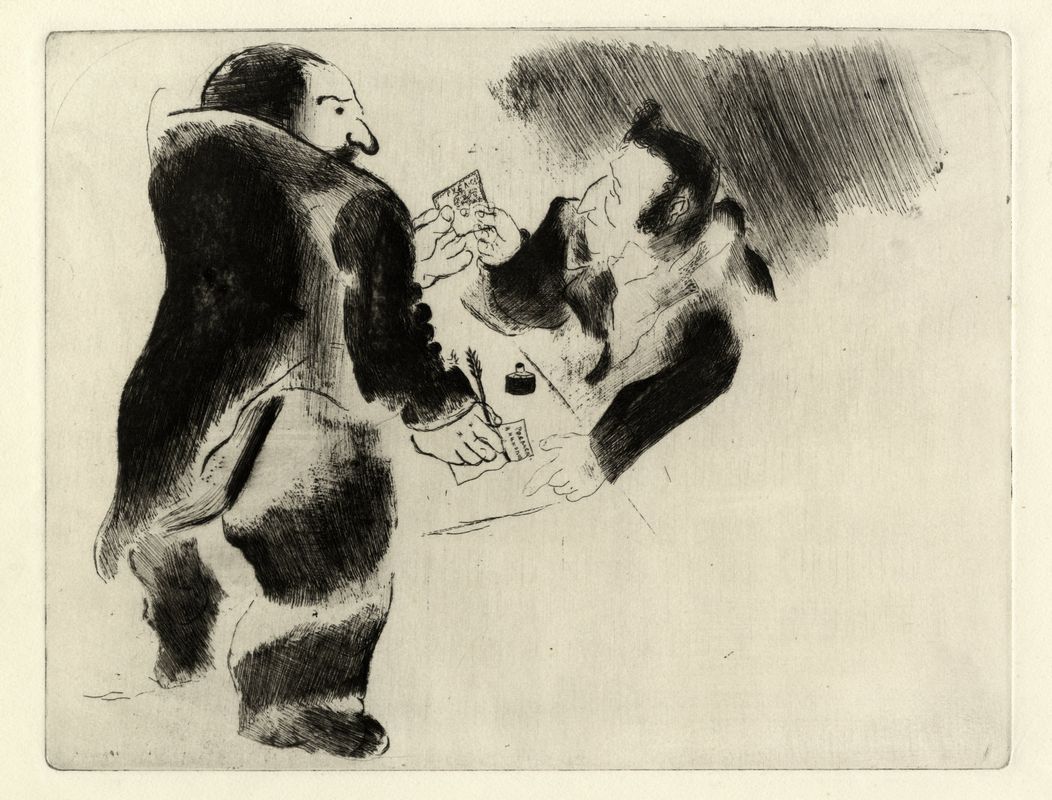 Acquaforte e puntasecca su carta Arches. mm 215x280. Foglio: mm 280x375. Tavola XXXVII ter dalla cartella Les Âmes mortes.