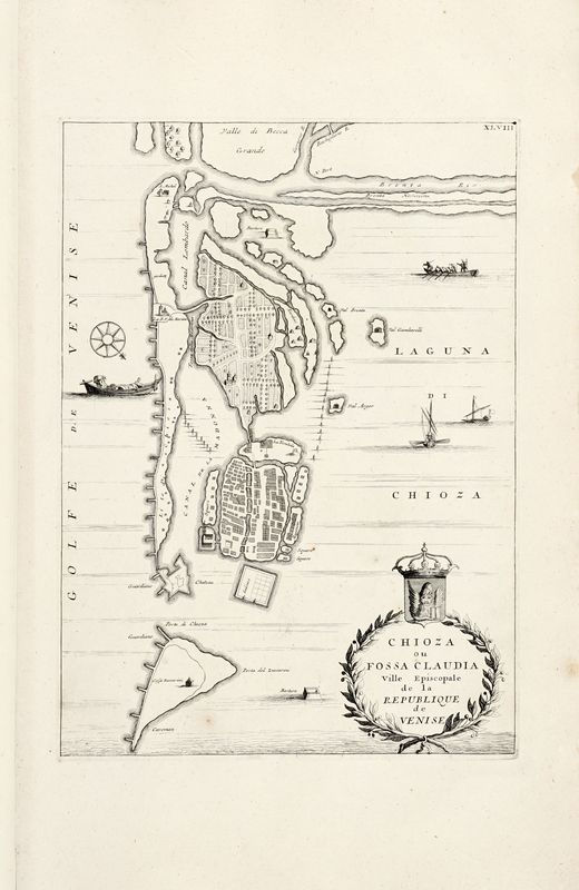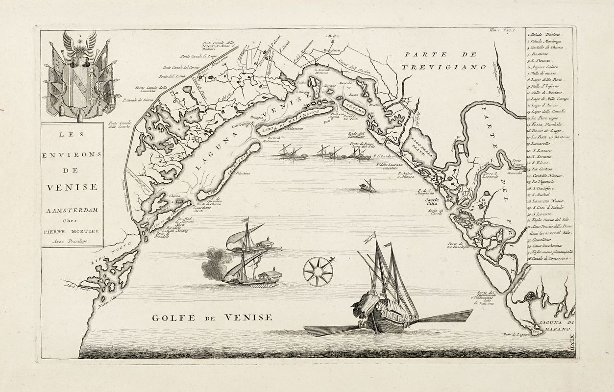 Incisione in rame. mm 268/375/400x270/284/430. Foglio: mm 370/560x350/560. Tre vedute della laguna veneta da Nouveau theatre d'Italie, ou description exacte de ses villes, palais, Eglises, principaux edifices... pubblicato ad Amsterdam nel 1704/1705 e di nuovo nel 1724.
