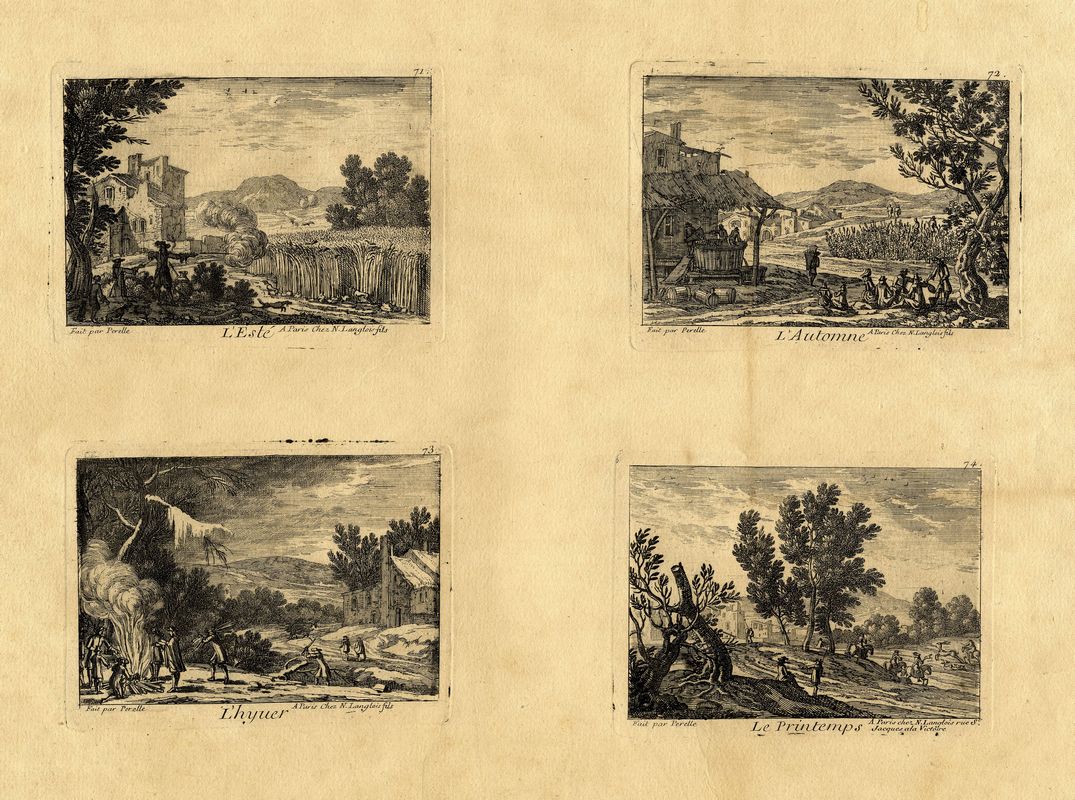 Acquaforte. mm 90/92x122/127. Foglio: mm 318x477. Serie completa in quattro piccole lastre impresse su unico foglio. Tutte le tavole con il titolo al margine inferiore al centro, "Fait par perelle" a sinistra, e a destra "A Paris Chez N. Langlois fils". Ottime impressioni su carta vergellata lievemente spessa.