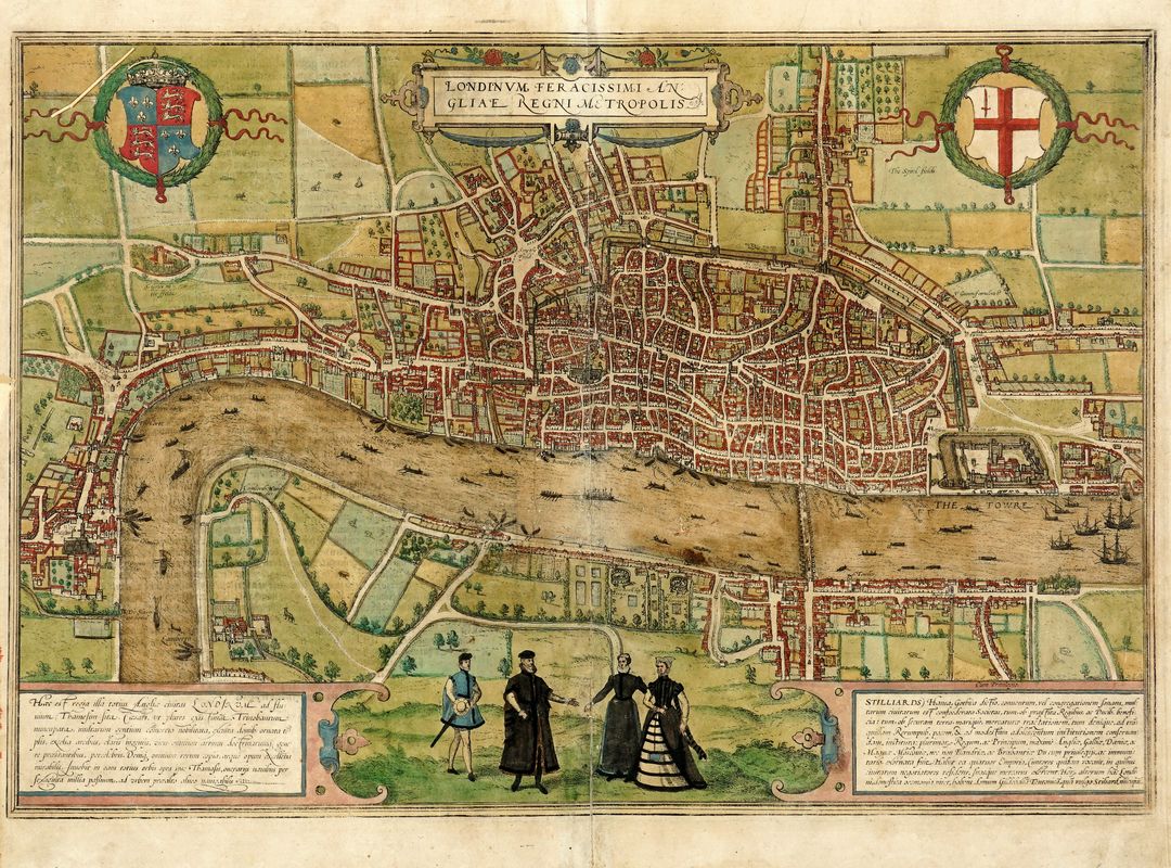 Acquaforte in coloritura. mm 333x485. Foglio: mm 390x500. Testo tedesco al verso. Veduta a volo d'uccello di Londra, apparsa nel I volume del Civitates Orbis Terrarum, pubblicato per la prima volta a Colonia nel 1572. La mappa è basata su una pianta di Londra in venti tavole ormai perduta che si ritiene sia stata realizzata tra il 1547 e il 1559. La Londra dei Tudor con i suoi sobborghi ora si estende fuori dalle mura della città, al centro si trova la cattedrale di St. Paul con la sua guglia, distrutta nel 1561. I giardini delle case e dei palazzi si estendono in direzione di Charing Cross, collegando la città mercantile con la corte reale di Westminster. Dall'altra parte del Tamigi, attraversato dal London Bridge, troviamo Southwark. Il fiume è solcato da navi e barche. I due riquadri di testo, che fiancheggiano le figure in costume in primo piano, descrivono l'economia della città. Esemplare nel II stato di 4, dopo la comparsa della scritta "cum privilegio" sopra il riquadro in basso a destra e prima della comparsa di un nuovo cartiglio con il titolo al posto dei personaggi in costume.