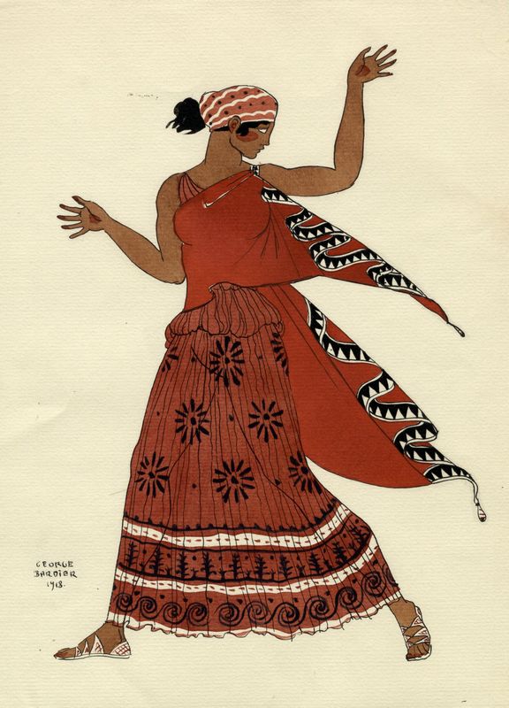 2 incisioni colorate a pochoir. mm 265x195 cad. Firmate e datate in lastra. Tratte da Bozzetti di Costumi Teatrali, del 1918, per la Commedia di Maurice Donnay intitolata "Lysistrata" (rappresentata nel 1919). I 2 pochoir sono inseriti nel volume "Vingt-cinq Costumes pour le Theatre" - Paris Meynial 1927. Uno dei due soggetti è pubblicato nel volume di Ercoli pag. 125 - fig. CXXXVIII.