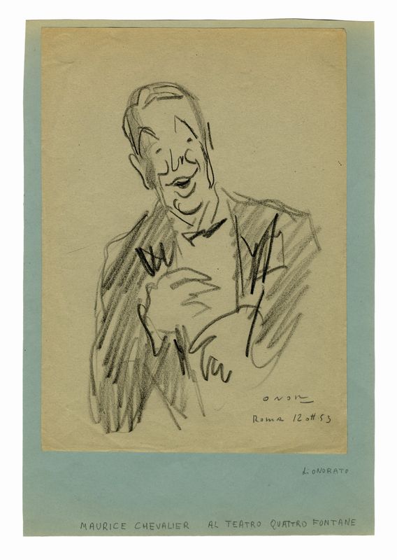 1) Maurice chevalier al Teatro Quattro Fontane. 1953. Matita su carta. mm 250x180. Firmato e datato in basso a destra e titolato in basso, al supporto. 2) Giacomino. Matita su carta. mm 250x155. Firmato in basso a destra e titolato in alto a sinistra.