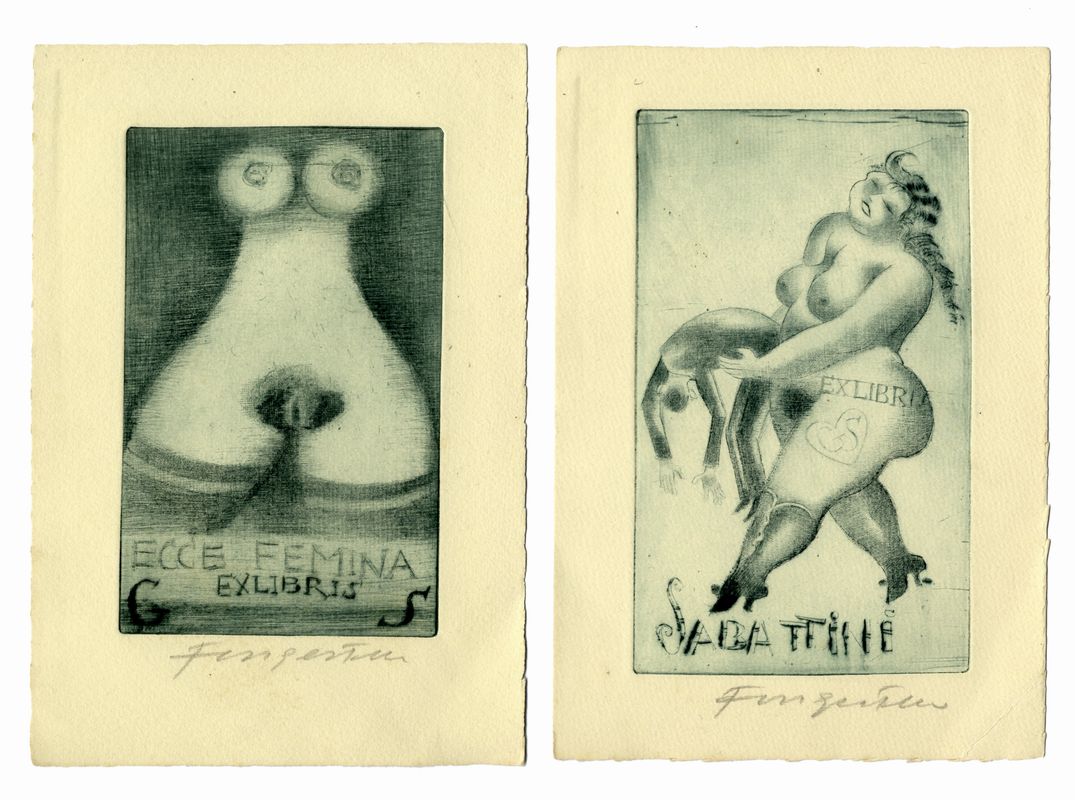 Ecce femina e Ex libris Sabattini. Incisioni all'acquaforte. mm 155x95 cad. Foglio: mm 200x135 cad. Entrambi firmati a matita in basso a destra.