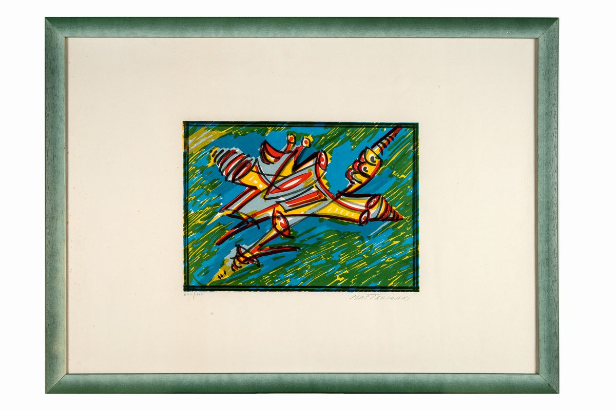 1) Senza titolo. Litografia. mm 250x345. Foglio: mm 500x700. Firma a matita in basso a destra e tiratura a numeri romani in basso a sinistra. Es XXII/XXII. 2) Senza titolo. Litografia. mm 330x470. Foglio: mm 550x690. Firma a pastello rosso in basso a destra. Prova d'artista.