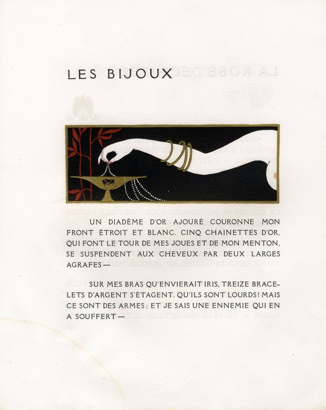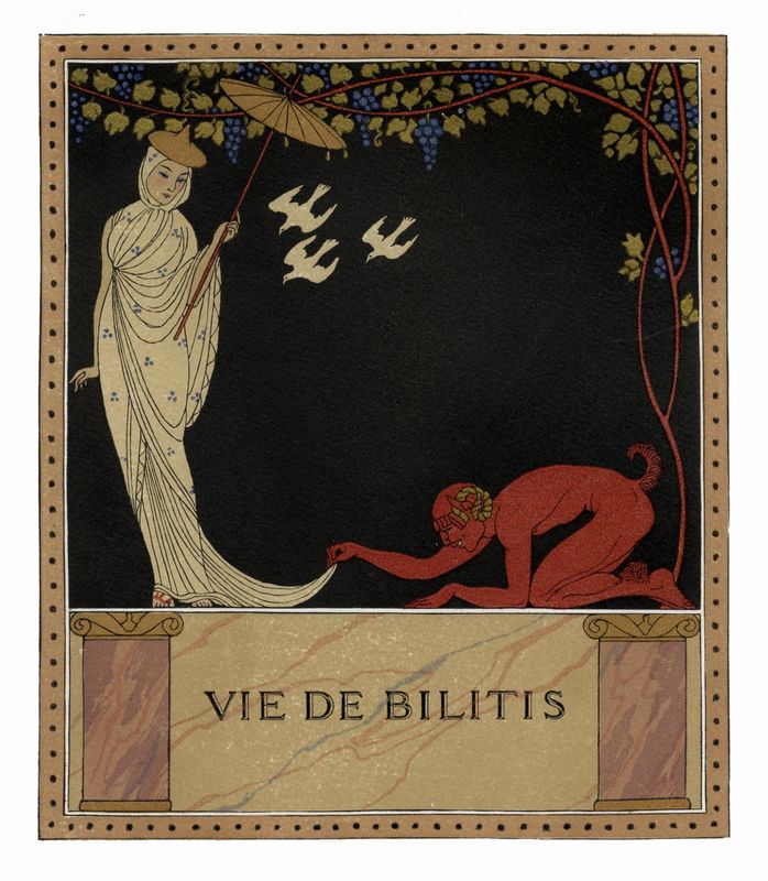 Xilografie colorata a pochoir (alcune stampate su bifoli). Misure varie. Fogli: mm 325x265 cad. Tratti da Pierre Loüys, Les chansons de Bilitis traduit du grec. Illustrations de G. Barbier gravées sur bois par L. F. Schmied. Paris : Collection Pierre Corrard, 1922.
