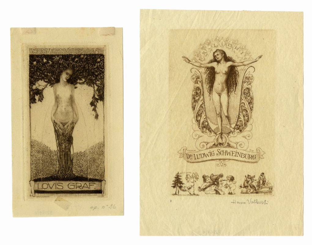 4 meravigliosi ex libris incisi. mm 100/145x55/90. Fogli: mm 160/206x94/164. Un ex libris con firma a matita in basso a destra, alcuni firmati, siglati e datati in lastra.