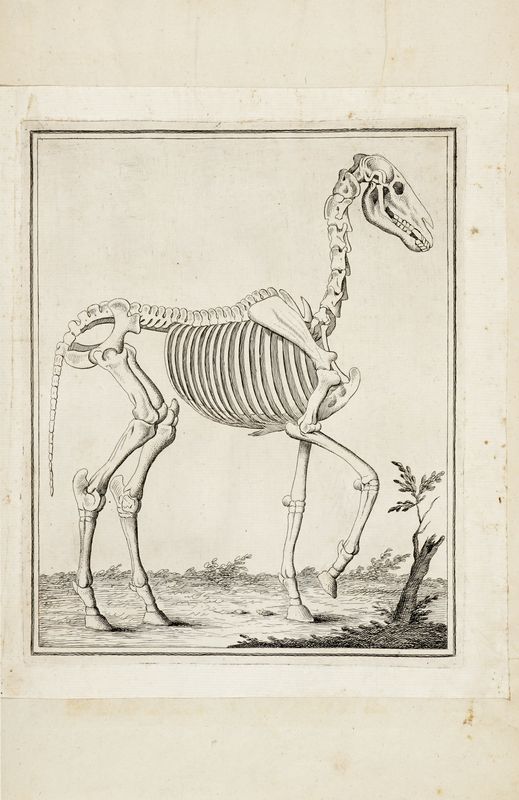 1) Rinoceronte - Rhinoceros Indicus. 1863 ca. Cromolitografia. mm 298x415. Edizione Raimondo Petraroja Libraio. 2) Foglio con applicate a pieno sei incisioni di granchi entro riquadri con didascalie e la data "1649" a penna e inchiostro bruno. Foglio: mm 425x280 3) Scheletro di cavallo.XVIII secolo. Acquaforte. mm 265x218. Foglio: mm 298x255. 4) Illustrazione con animali esotici. Bulino. mm 130x163. Da Arnoldus Montanus, Gedenkwaerdige Gesantschappen, 1669. 5) Tavola anatomica con parte di scheletro umano e teschio. XIX secolo. Bulino. mm 260x200. Foglio: mm 330x270.