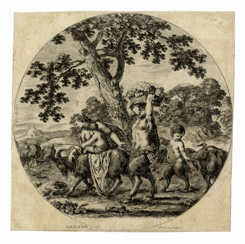 Acquaforte. 1) La famiglia del satiro in cammino verso sinistra. mm 222x224. DeVesme/Massar, 103. Bellissima prova nel II stato su 3 avanti l'indirizzo di Mariette, su carta vergellata lievemente spessa priva di filigrana. 2) Coppia di tavole da Diverse figure e paesi. mm 90/95x155/159. DeVesme/Massar,167/168. Bellissime impressioni nell'unico stato su sottile carta vergellata con filigrana "scudo con corno da caccia sormontato da corona" visibile su entrambi i fogli. 3) Teste di cavallo. mm 115x150. Foglio: mm 118x154. DeVesme/Massar, 728. Da Têtes de différents animaux serie di quattro tavole. Ottima prova nel II stato di 3 dopo la numerazione, su carta vergellata sottile priva di filigrana. 4) Coppia di fregi dalla serie di 12 tavole in verticale Ornamenti e grottesche. mm 164/168x62/65. Foglio: mm 180/187x73/87. DeVesme/Massar, 1006/1008. Ottime impressioni su carta vergellata con parte di filigrana "AUVERGNE". Al verso di uno dei fogli marchio in rosso della collezione Robelot (Lugt, 2141).