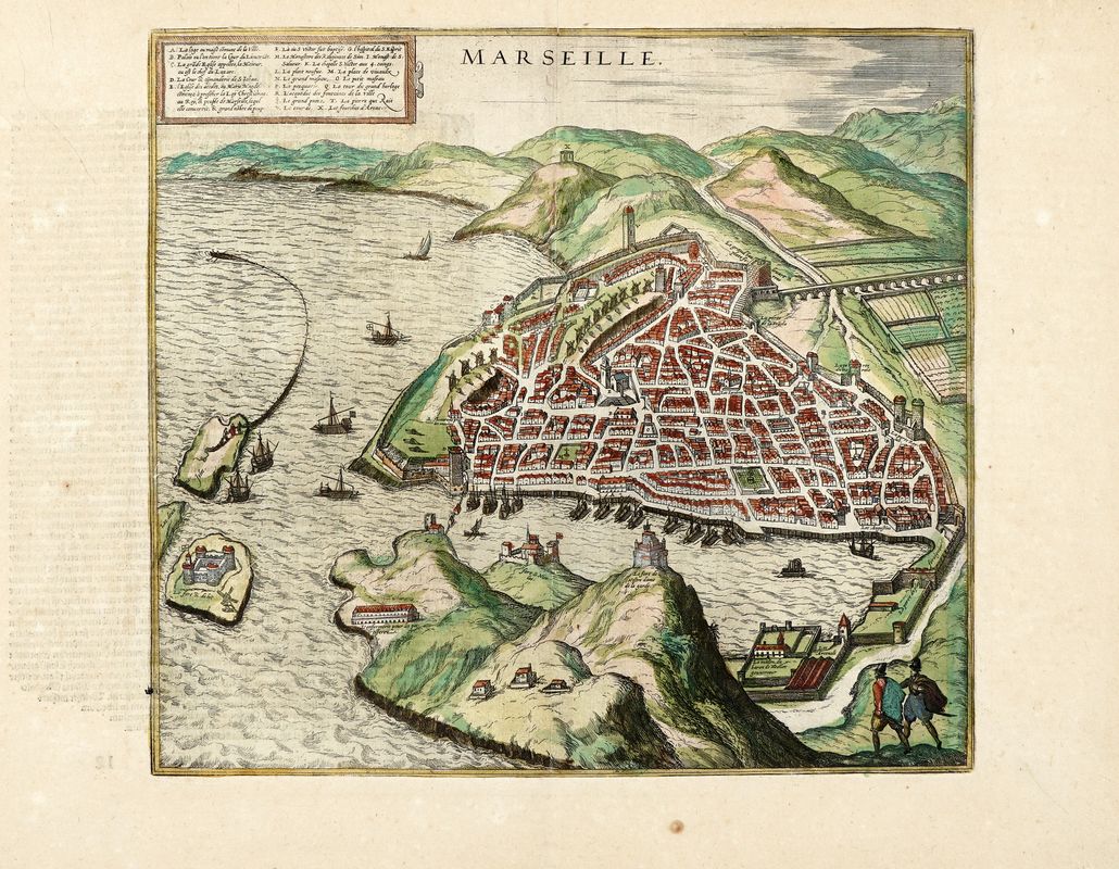Incisione in rame, in coloritura. mm 318x353. Foglio: mm 400x530. Dal II volume di Civitates Orbis Terrarum, pubblicato per la prima volta nella versione latina nel 1575. Testo tedesco al verso. Veduta di Marsiglia da sud-est, con una parte dell'arcipelago del Frioul all'estrema sinistra, le due isole principali di Pomègues e Ratonneau e la piccola isola di If. La fortezza sull'If deve la sua fama principalmente al romanzo Il conte di Montecristo di Alexandre Dumas, in primo piano arroccata su un'alta scogliera si osserva la fortezza di Notre-Dame de la Garde, costruita nel 1525.