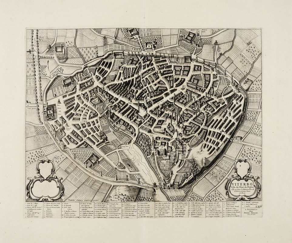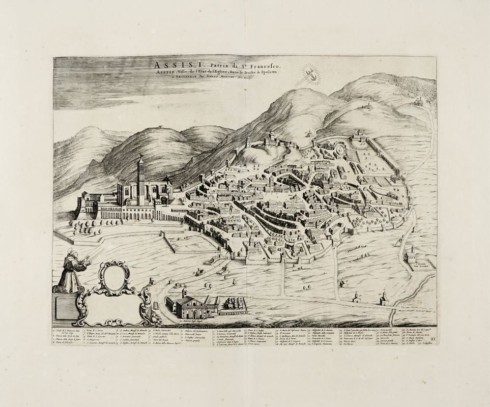 Incisione in rame. mm 450x565. Foglio:mm 575x690. SI AGGIUNGONO: Viterbo. Ville de l'Etat de l'Eglise... Incisione in rame. mm 420x532. Foglio: mm 575x685./ Assisi. Patria di S.t Francesco. Assise, Ville de l'Etat de l'Eglise, Dans le Duché de Spolette. Incisione in rame. mm 393x525. Foglio: mm 577x 698. Lotto di tre tavole da Nouveau theatre d'Italie ou description exacte de ses villes, palais, eglises, opera pubblicata ad Amsterdam nel 1704/1705 e di nuovo nel 1724.