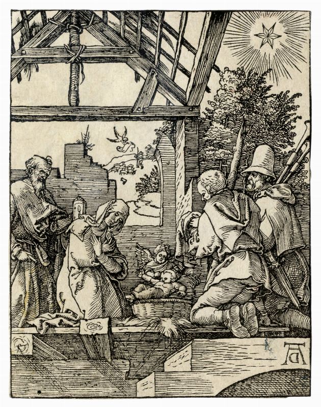 Xilografia. mm 127x98. Meder, 129. Strauss (Woodcuts), 140. Schoch, Mende, Scherbaum, (Holzschnitte), 190. Con il monogramma in controparte in basso a destra. Tavola dall’edizione prima del testo de La piccola passione su legno, serie in 37 tavole completa di frontespizio realizzata da Dürer tra il 1508 e il 1510, dapprima circolante in fogli sciolti e poi riunita nel 1511 in un volume rilegato dotato di frontespizio e con l'aggiunta di versi latini nel retro di ciascun foglio, redatti dal monaco Benedetto Chelidonio. Ottima prova stampata con buona traccia di gauffrage al verso. Al verso in basso marchio di collezione del banchiere Hans Rinn (Lugt, 4049).