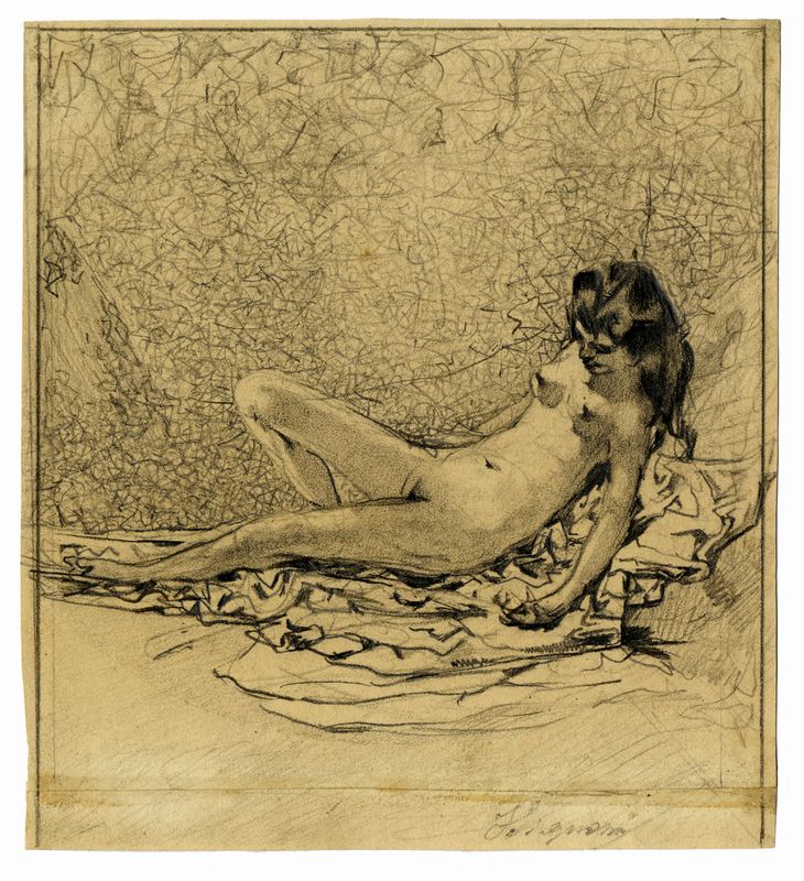 Matita su carta beige, disegno parzialmente riquadrato. mm 199x181. Firmato in basso a destra. Pubblicato su: Bucarelli Palma (presentazione di), Mostra di disegni di Telemaco Signorini, Galleria Nazionale d'Arte Moderna Roma, Valle Giulia, 13 aprile-11 maggio 1969, tavola 485.