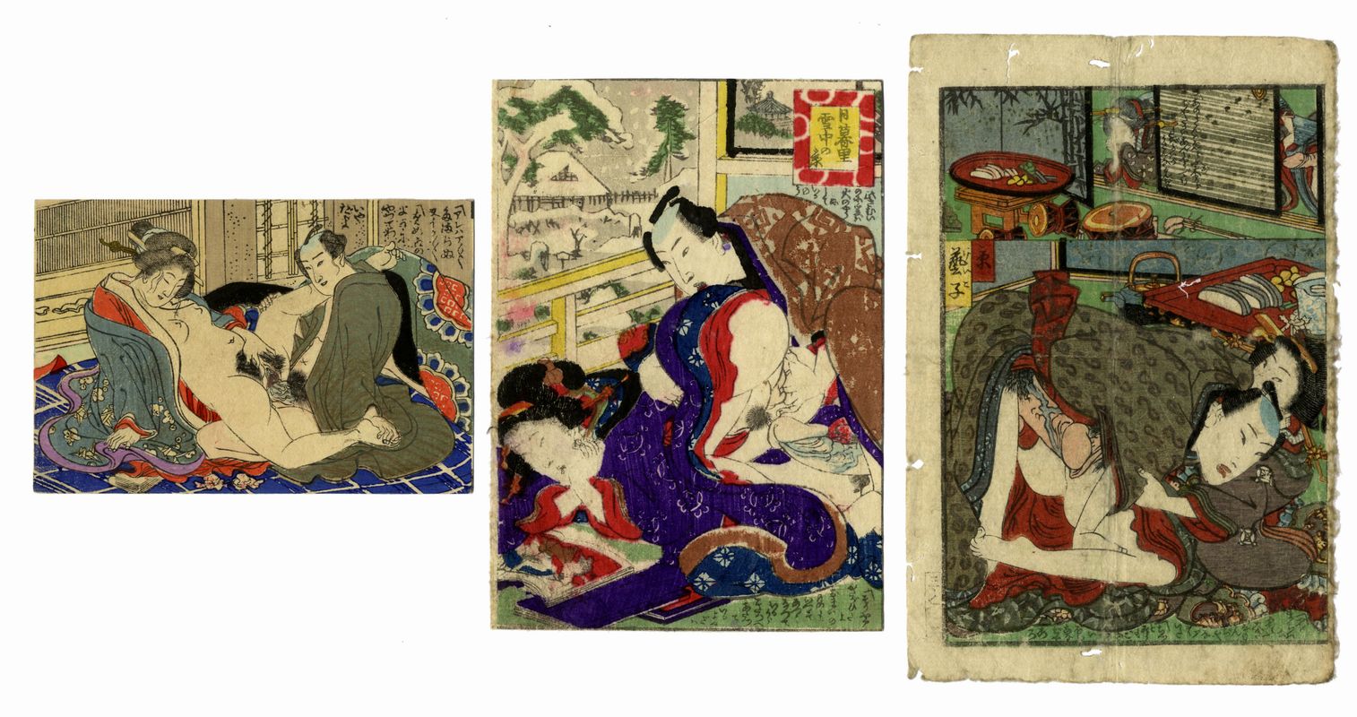 Xilografia a colori: nishike-e. Formato: Yotsugiri (mm 80/180x118/120). Lotto di otto piccole tavole a soggetto erotico.