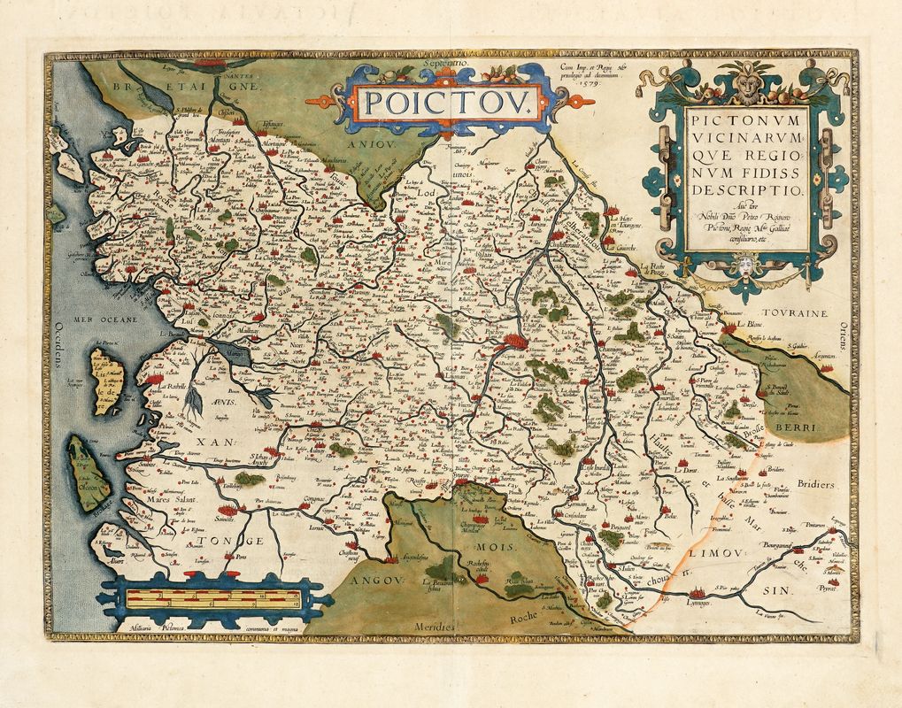 Incisione in rame, in coloritura. mm 360x504. Foglio: mm 450x560. Dalla rara edizione spagnola del 1588 stimata in 100 copie, Theatro de la Tierra universal con testo al verso. Bella carta della regione del Poitou con al centro la città di Poitiers raggiungibile dall'Atlantico a La Haye, vi sono raffigurate Limoges, Nantes e Cognac e il corso dei fiumi La Charente e Taurion. Ben visibili Ile de Re e Ile d'Oleron.