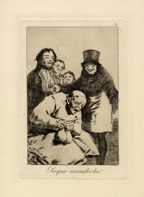 Acquaforte, acquatinta brunita e puntasecca. mm 215x150. Foglio: mm 335x238. Harris, 65. Con il titolo al margine inferiore e il numero in alto a destra. Trentesima tavola da Los Caprichos serie in 80 tavole pubblicata per la prima volta dallo stesso Goya nel 1799, ed edita in complessive 12 edizioni. Bellissima prova nel III stato su 3, comune a tutte le impressioni editoriali, stampata a inchiostro nero e seppia su carta spessa non vergellata priva di filigrana. Esemplare dalla V edizione, dopo la bisellatura della lastra, stampata dalla Calcografia per la Real Academia tra il 1881 e il 1886.