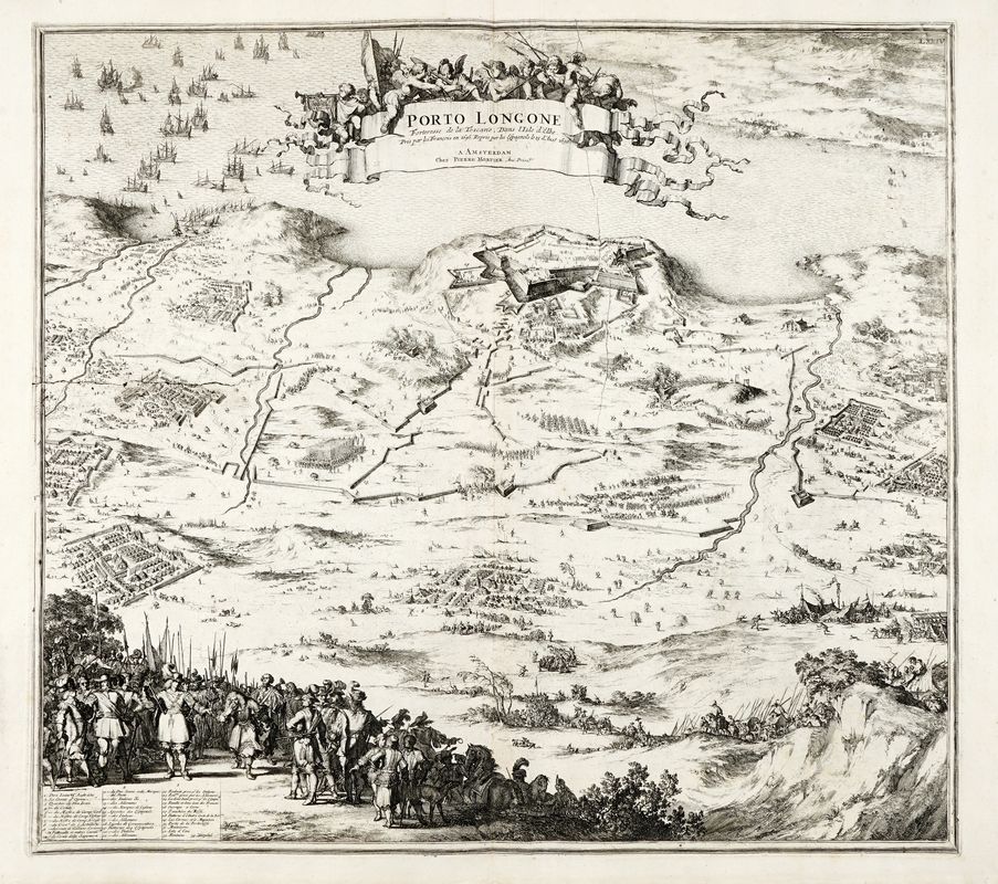 Incisione in rame. 520x575. Foglio: mm 565x665. Veduta di Porto Azzurro, come recita il cartiglio del titolo "presa dai Francesi nel 1646 e riconquistata dagli spagnoli il 15 agosto 1650". Da Nouveau theatre d'Italie, ou description exacte de ses villes, palais, Eglises, principaux edifices... pubblicato ad Amsterdam nel 1704/1705 e di nuovo nel 1724.