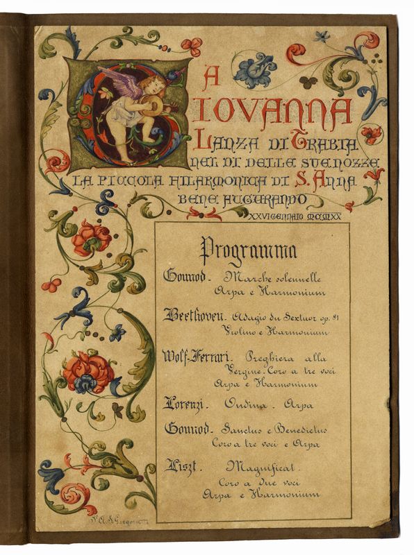 Acquerello su cartone. mm 270x185. Firmato in basso a sinistra. Meraviglioso programma musicale dedicato: "a Iovanna Lanza di Trabia nel di delle sue nozze, la piccola filarmonica di WS. Anna, bene augurando". Entro la sua cartella originale con impressa la data a caratteri dorati al piatto anteriore.