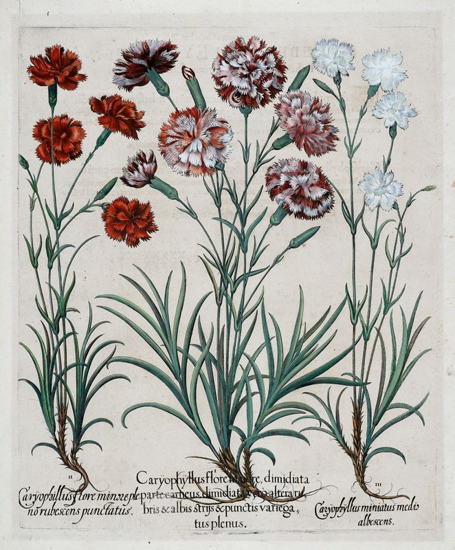 Bulino, tempera e acquerello a colori. mm 475/480x390/400. Foglio: mm 525/567x420/442. Quattro tavole con testo al verso (1. Geranium Batrachisides cerul / Geranium muscatum in odorum.../ 2. Papaver laciniatum rubrum unguibus purpureis / Tordilium creticum.../ 3. Caryophillus flore minore pleno rubescens punctatus / Caryophillus.../ 4. Cinosorchis flore purpureo / Asphodelus maior albus...) da Hortus Eystettensis, monumentale florilegio botanico in 367 tavole raffiguranti più di 1000 specie, edito per la prima volta nel 1613 a cura del farmacista Basilius Besler (Norimberga 1561-1629). Anche se l'opera viene associata al suo nome, si deve a Besler unicamente la curatela e l'organizzazione dei numerosi artefici chiamati a realizzare l'impresa commissionatagli nel 1611 da Johann Konrad von Gemminge principe arcivescovo di Eichstätt: i disegni dal vero si devono a Sebastian Schedel (1570-1628), le prime lastre a bulino vennero incise da Wolfgang Kilian (1581-1662) e aiuti, la coloritura a mano venne commissionata al colorista di Norimberga Georg Mack e alla sua famiglia, le descrizioni botaniche si devono infine, almeno in parte, a Ludwig Jungermann (1572-1653). Il volume conta tre edizioni, la prima nel 1613 in due versioni, una commerciale (con testo al verso) e una di lusso (con testo in foglio separato e carta filigranata), la seconda nel 1640, la terza prevista nel 1713 per il centenario venne di fatto eseguita nel 1750. Bellissimi esemplari su carta vergellata pesante, con testo al verso e coloritura postuma, dall'edizione del centenario. Bibliografia: N. Barker, Hortus Eystettensis. The Bishop's Garden and Besler's Magnificent Book, London 1994. A. Carroll, The Hortus Eystettensis: How Paper Type Can Help Decipher Printing History, in «The Papers of the Bibliographical Society of America», 103, 3,September 2009, pp. 391-400.