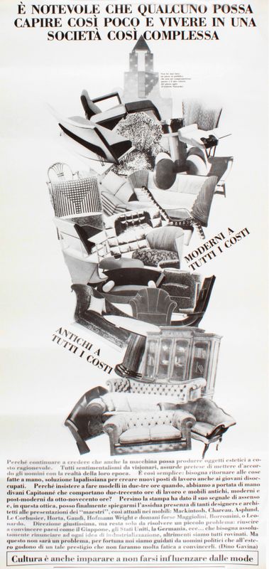 Compongono il lotto: 1) È notevole che qualcuno possa capire così poco e vivere in una società così complessa. Manifesto di Dino Gavina Antichi a tutti i costi. Moderni a tutti i costi. (mm 700x330); 2) La bellezza è l'amore che dedichiamo a un oggetto. Cartolina con testo autografo di Dino Gavina, datato 7/7/92; 3) Produrre è comunicare. Tamburi bit messaggi, meeting 1986. Pieghevole a 6 ante (mm 100x165); 4) Raymond. Gavina. Pieghevole a 3 ante (mm 238x230); 5) Documenta: La casa di Kandinsky [...] Il nuovo negozio di Carlo Scarpa a Bologna [...]. Estratto da Zodiac, numero 10, 1962; 6) Marcel Breuer 1924, Gavina 1962. Manifesto pieghevole a colori, stampato fronte/retro; 7) Marcel Gavina. Manifesto pieghevole a colori, stampato fronte/retro. Elenco completo disponibile su richiesta.